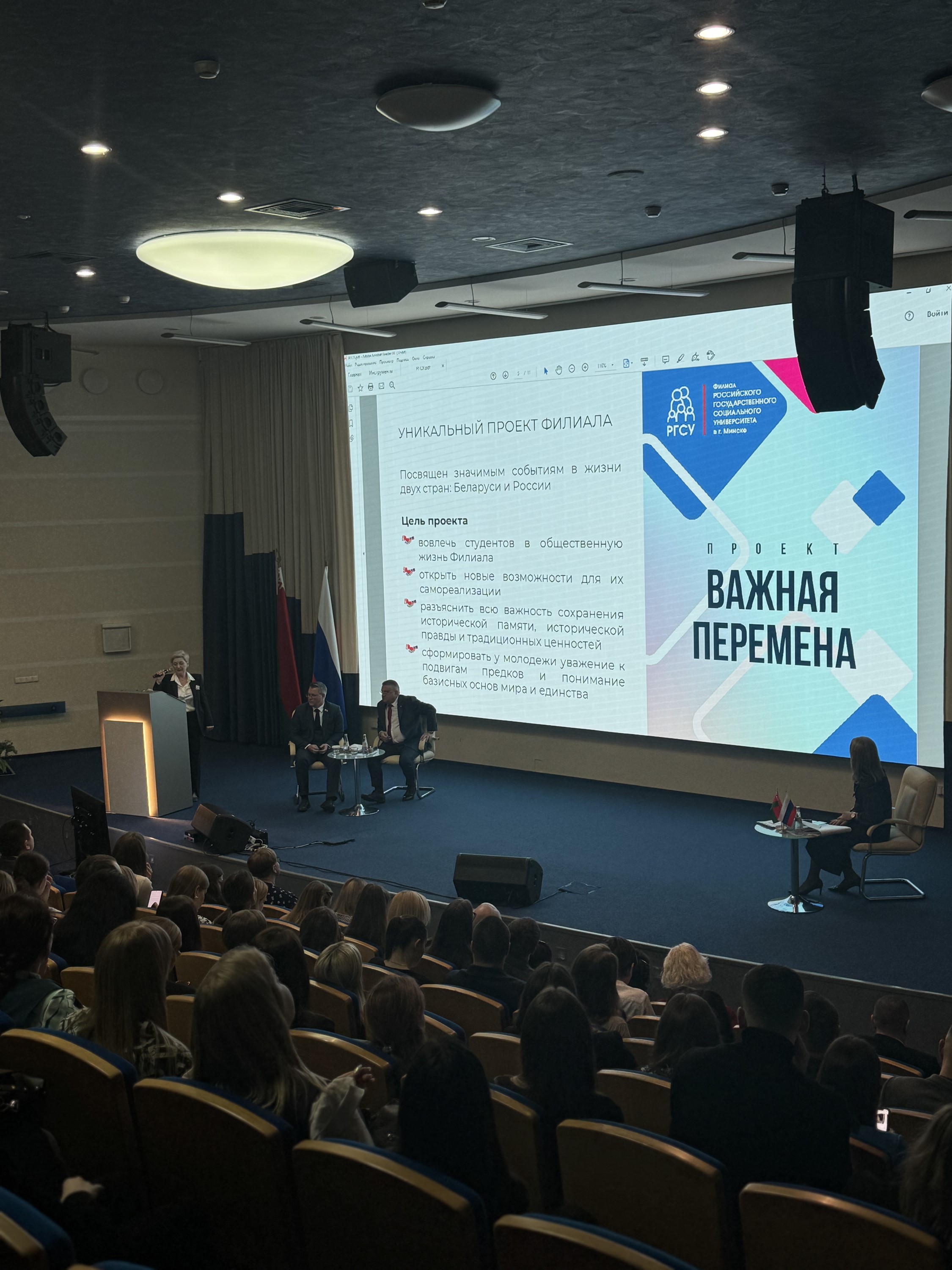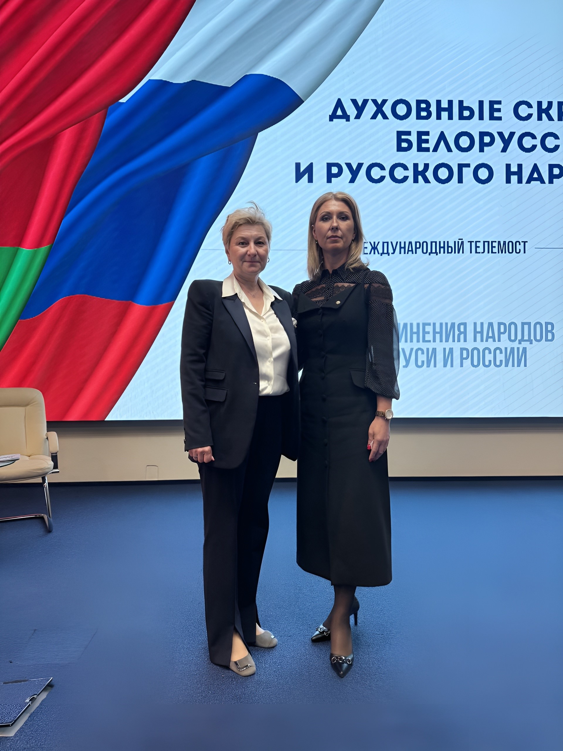 В ходе телемоста директор Филиала Ирина Олеговна Селезнева, выступила с докладом о вкладе РГСУ в развитие Союза Беларуси и России. Она рассказала о просветительских и образовательных проектах, реализуемых на базе университета, в том числе о проекте «Важная перемена» и серии брошюр про семейные ценности.